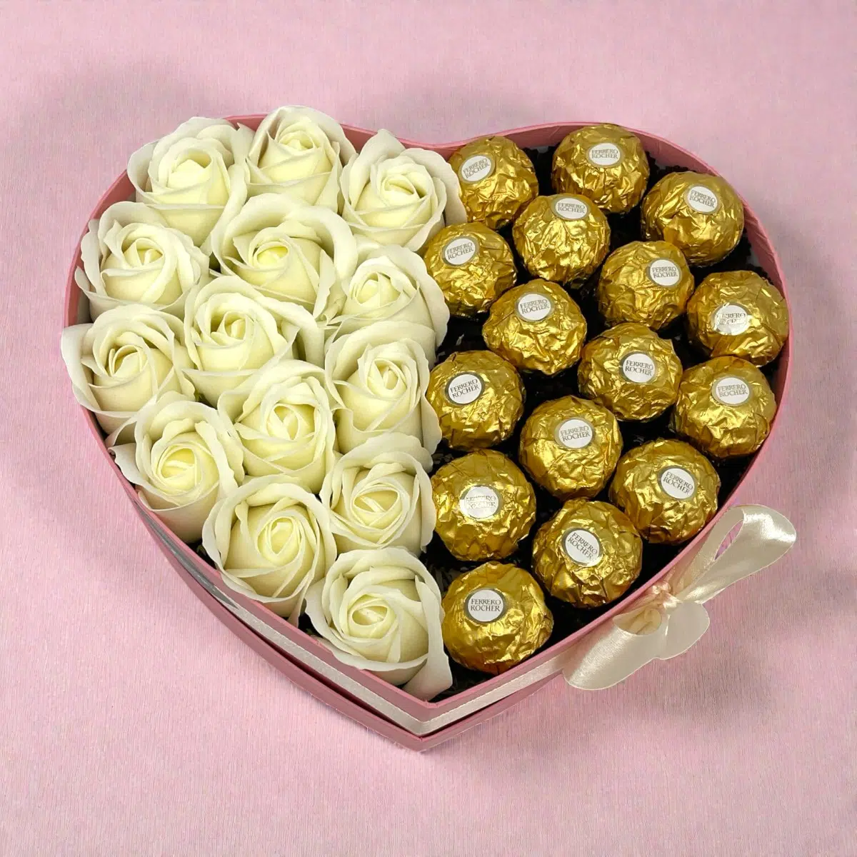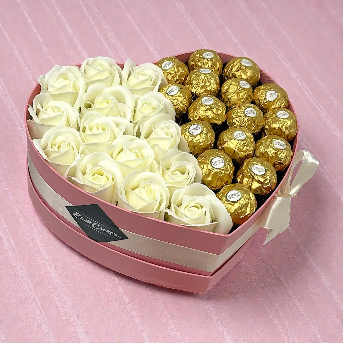 Classic szív box – Ferrero + krém rózsa