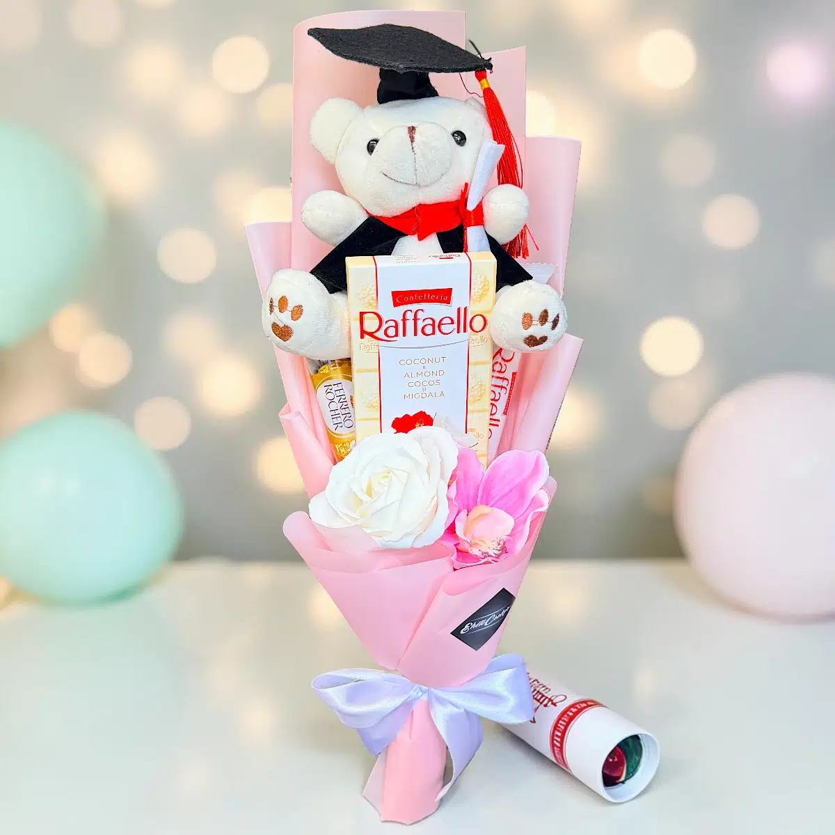 Fehér maci ballagó csokor